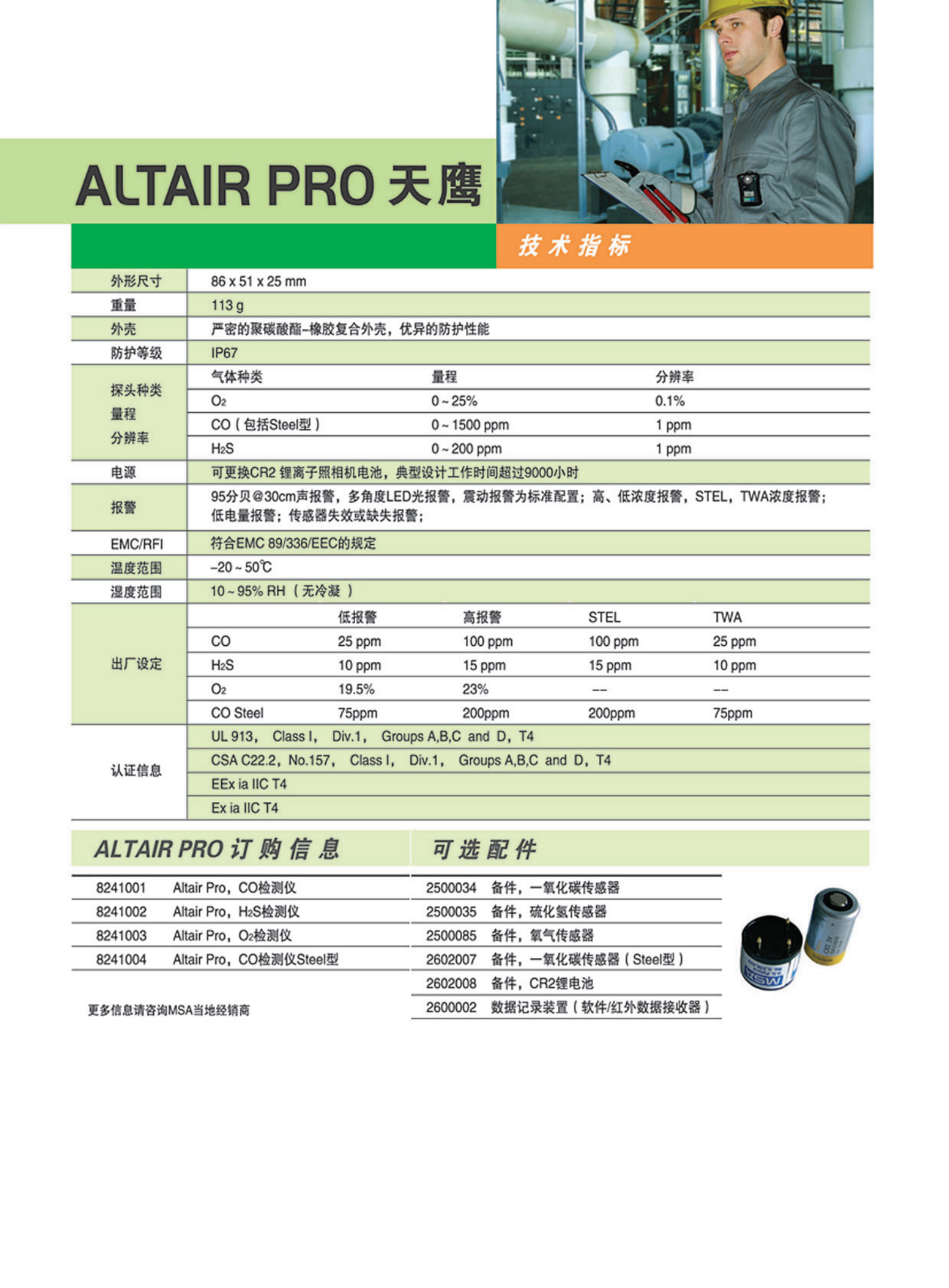 Altair Pro天鹰单一气体检测仪采用高精度的电化学传感器检测环境中的有毒气体浓度或氧气的百分比浓度。可分别检测氧气、一氧化碳、硫化氢、氯气、二氧化硫、氨气等13种有毒气体。Altair Pro 天鹰已嵌入了数据记录功能作为标准配置,能自动记录最近的50个事件。配合MSA 红外适配器及软件,可进行报警设置的修改,也可将仪表记录下来的数据导入电脑,进行追踪管理。